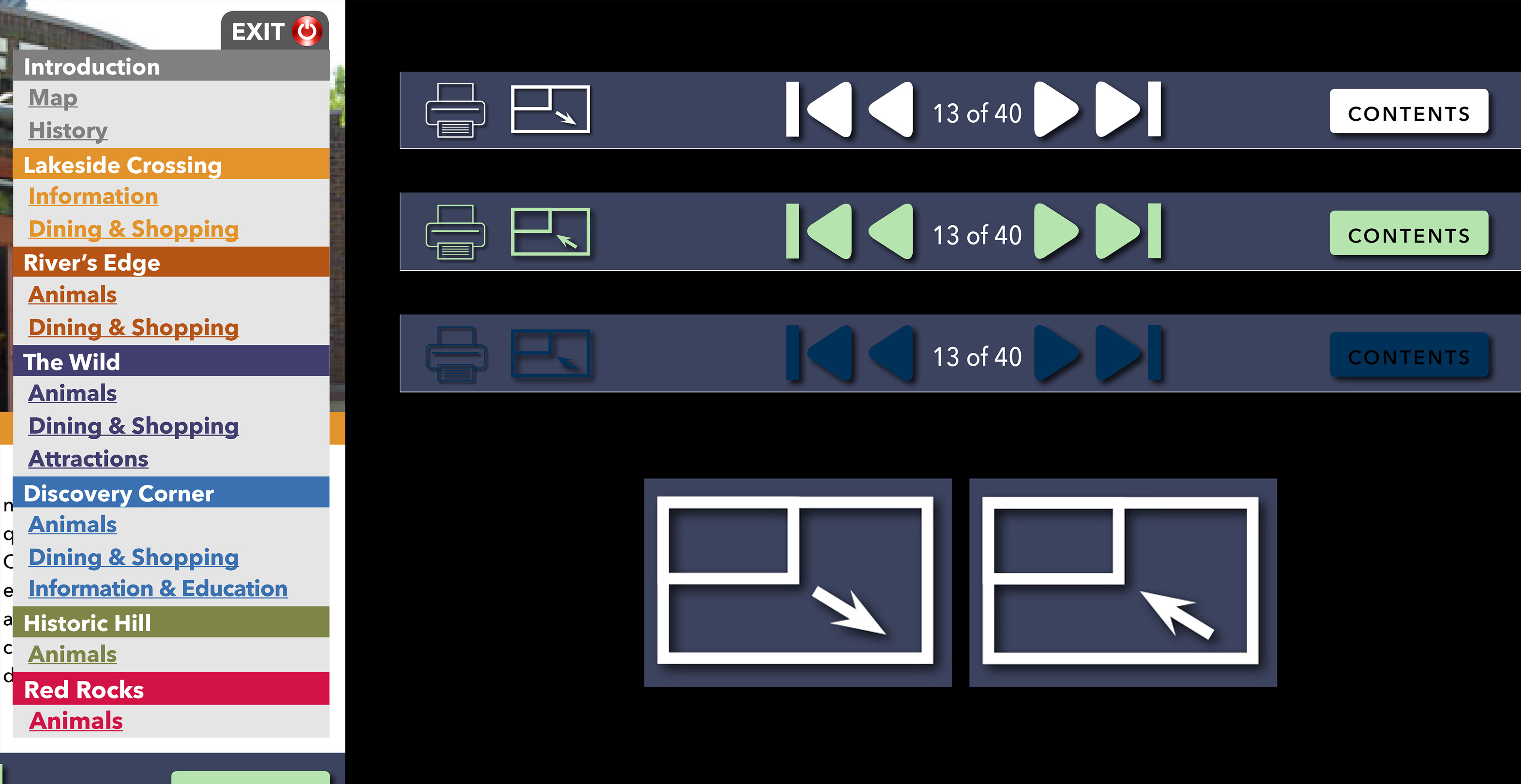 An interactive zoo guide created with the intentions of being used either with personal iPads or a touch screen kiosk.