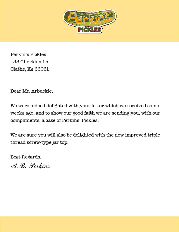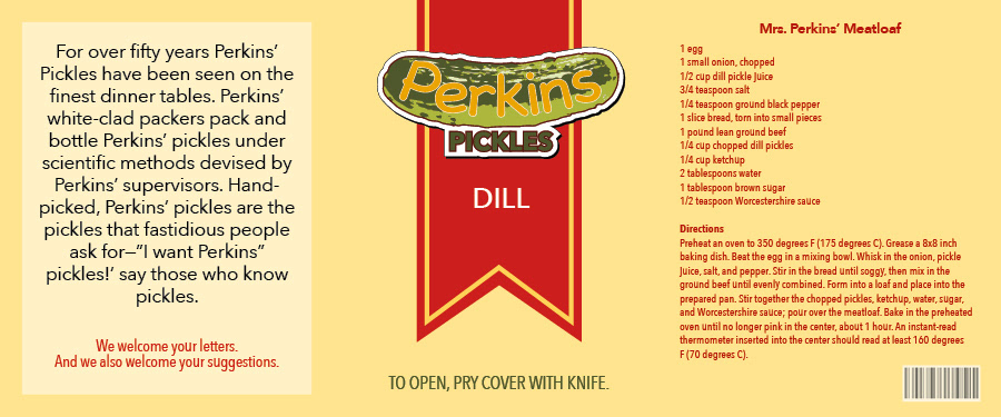 During the Spring 2016 one-acts at MNU, I was given the task of creating a logo, pickle jar label, and letter for one of the plays. Perkins' Pickles is a fictitious company used during a skit called "To Open, Pry Cover."