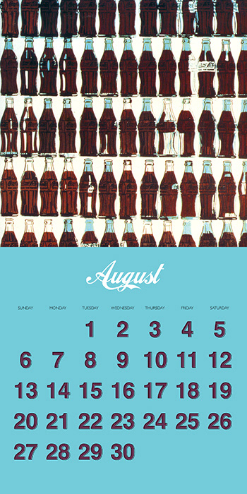 A 12-month calendar where the calendar grid mimics the design work of famous pop pieces of American Pop Art.