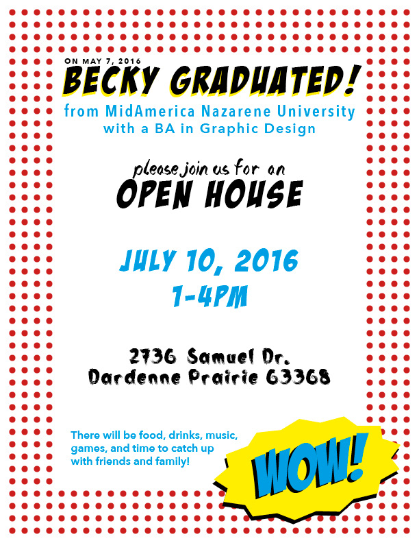 A graduation party for a BA in Graphic Design calls for an invitation with a graphic punch! Turning to Lichtenstein and other American Pop Artists, this design uses only 4 colors.
